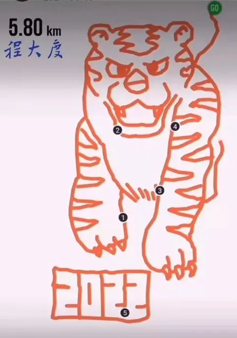 “跑图案之前要找点,然后把图案手动输进去。跑的时候,要时间拿入部下手机看着。跑完一笔,不错在软件上按暂停,这么就不会跟新的笔画连起来。”其先容,跑出一个老虎大致6公里,要5小时支配,得带上充电宝。加上踩点的时间,盘算十多个小时,一般不会安排在清除天。