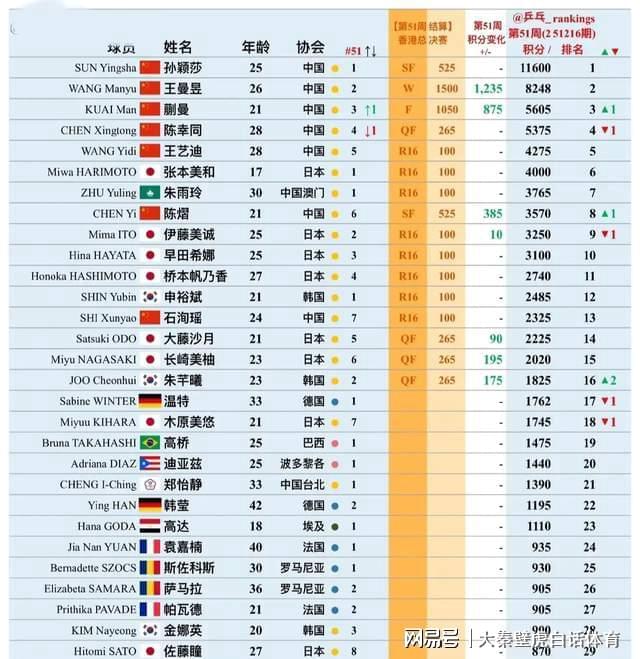 底下,让我一皆走进WTT年终积分排行。