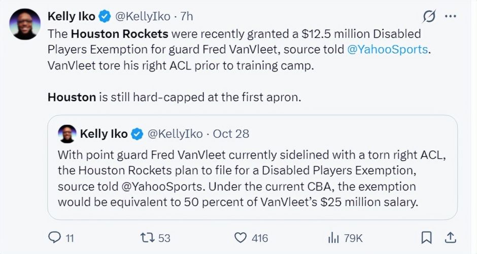 通过这份1250万的伤病特例,不错签下别称、往返获得别称、认领别称年薪最高1250万好意思元且协议为期一年的协议,但当今火箭距离第一土豪线独一125万是以球队无法签下、认领,只可通过往返的神气。