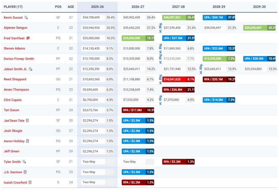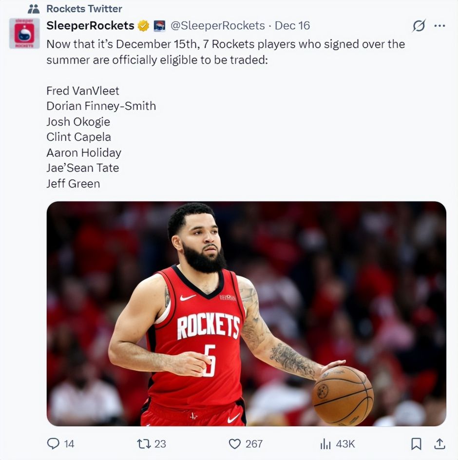 在12月16日后,今夏跟火箭队签下协议的7位球员照旧解开了往返法规:范弗利特、芬尼史小姐、奥科吉、卡佩拉、霍勒迪、泰特、杰夫-格林。