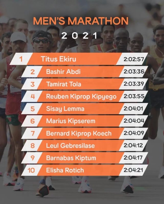 位列第一的是肯尼亚的Titus Ekiru,在2021年的意大利米兰马拉松上,他跑出了2:02:57的收获,这是2021年最快的马拉松收获。