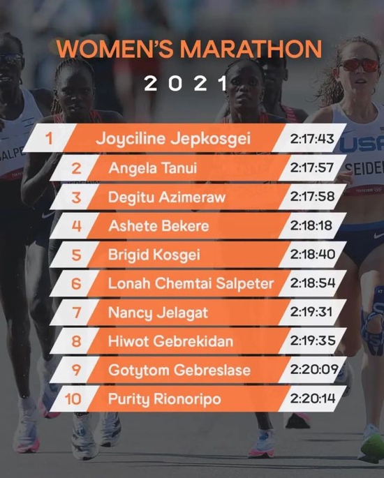 寰球田径近期发布了2021年度男女马拉松、半程马拉松寰球前十的榜单,至于中国男女马拉松和半程马拉松在2021年度的最好收获均在100名开外。