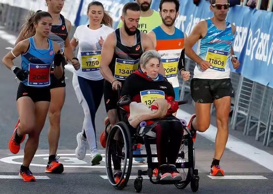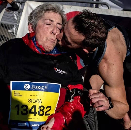 在2021年11月的巴塞罗那马拉松上,当28岁的埃里克·多明戈·罗尔丹推着轮椅上的母亲,并用时2小时53分28秒冲过至极时,他们一举艰涩了推轮椅赛马拉松的吉尼斯天下记载。