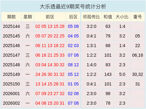 上期开奖数据中得知邻孤传比为2:3:0,大小比为2:3,无重号,和值数据为78。